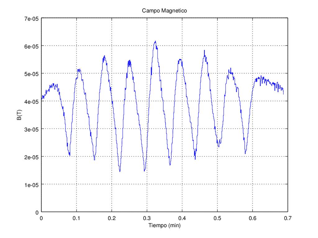 En este caso medimos campos que pasan de los 60 microtestas, aparentemente estacionarios (aunque no sé si realmente se está midiendo el promedio temporal de un campo oscilante de más alta frecuencia). La modulación que se observa proviene del movimiento del sensor (que está bajando en un ascensor), de tal manera que lo que estamos viendo es una variación en el espacio, y no en el tiempo.